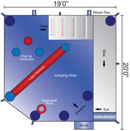 This is one of our biggest castles which features pop up obstacles, climbing stairs, slide, jump area