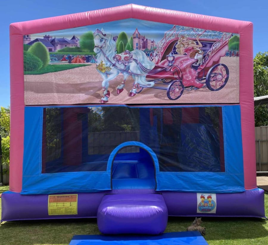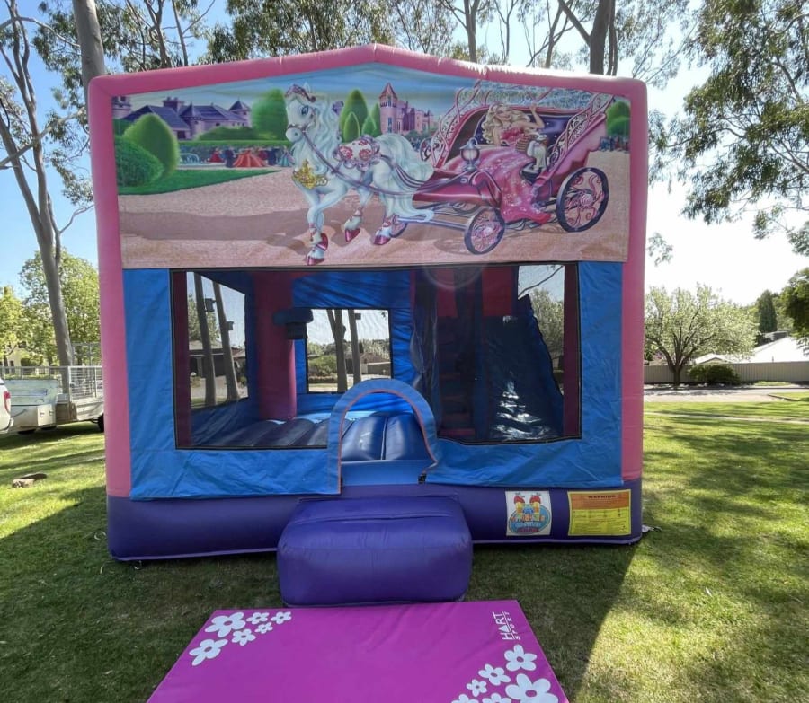 This castle features a jumping area, climbing stairs, internal slide and a basketball hoop (Supply own plastic ball)