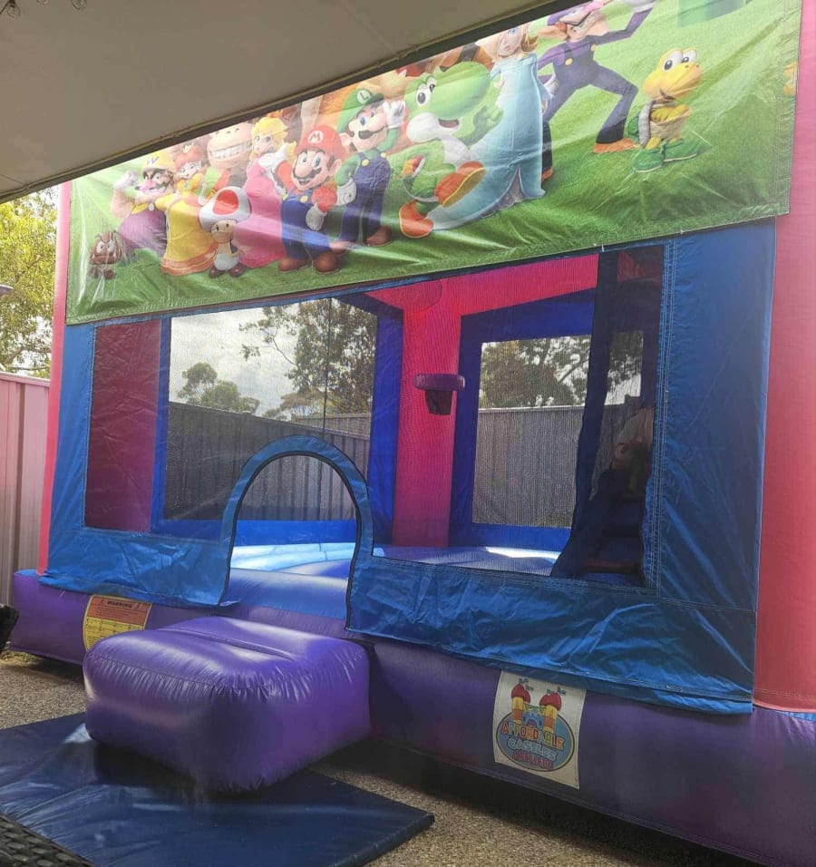 This castle features a jumping area, climbing stairs, internal slide and a basketball hoop (Supply own plastic ball)