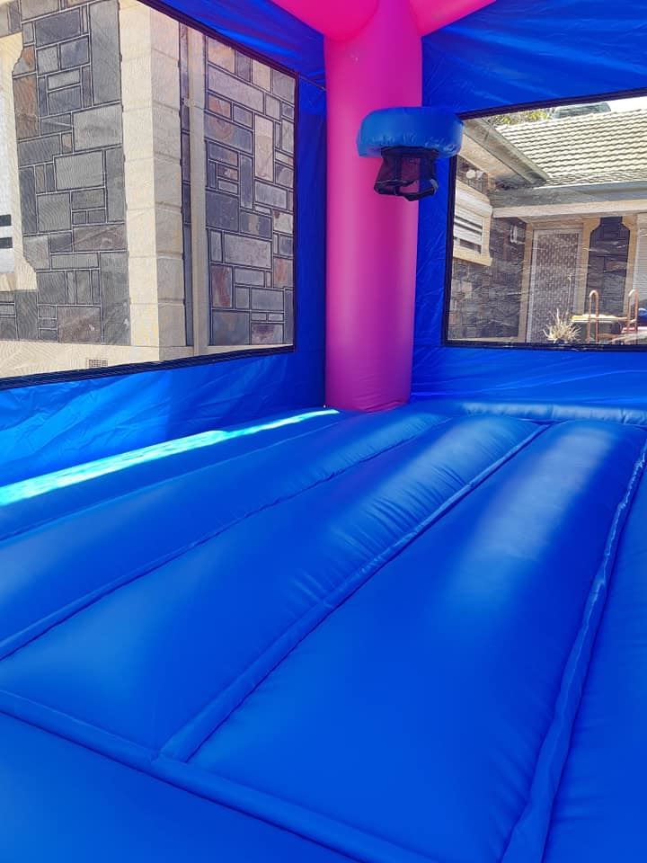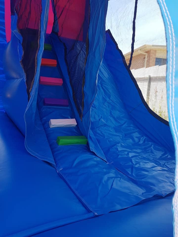 This castle features a jumping area, climbing stairs, internal slide and a basketball hoop (Supply own plastic ball)