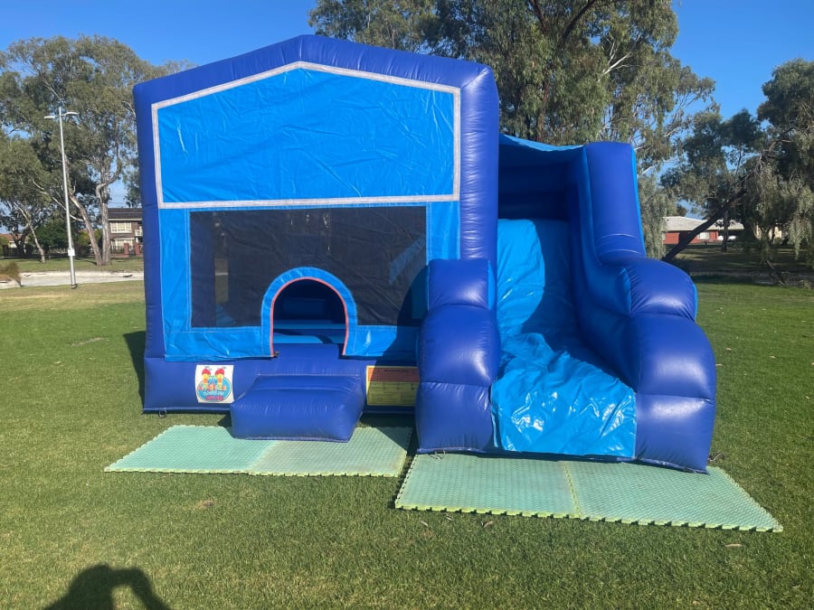 This castle features a jumping area, push obstacles, climbing stairs, external slide and a basketball hoop (Supply own plastic ball)