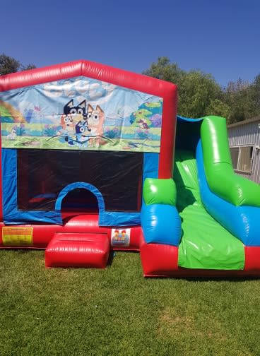 This castle features a jumping area, push obstacles, climbing stairs, external slide and a basketball hoop (Supply own plastic ball)