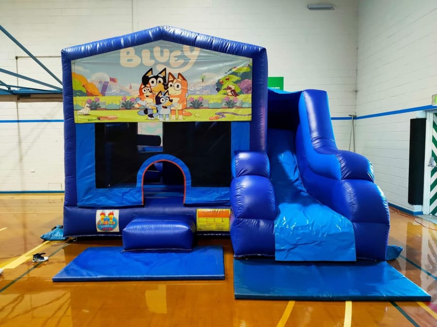 This castle features a jumping area, push obstacles, climbing stairs, external slide and a basketball hoop (Supply own plastic ball)