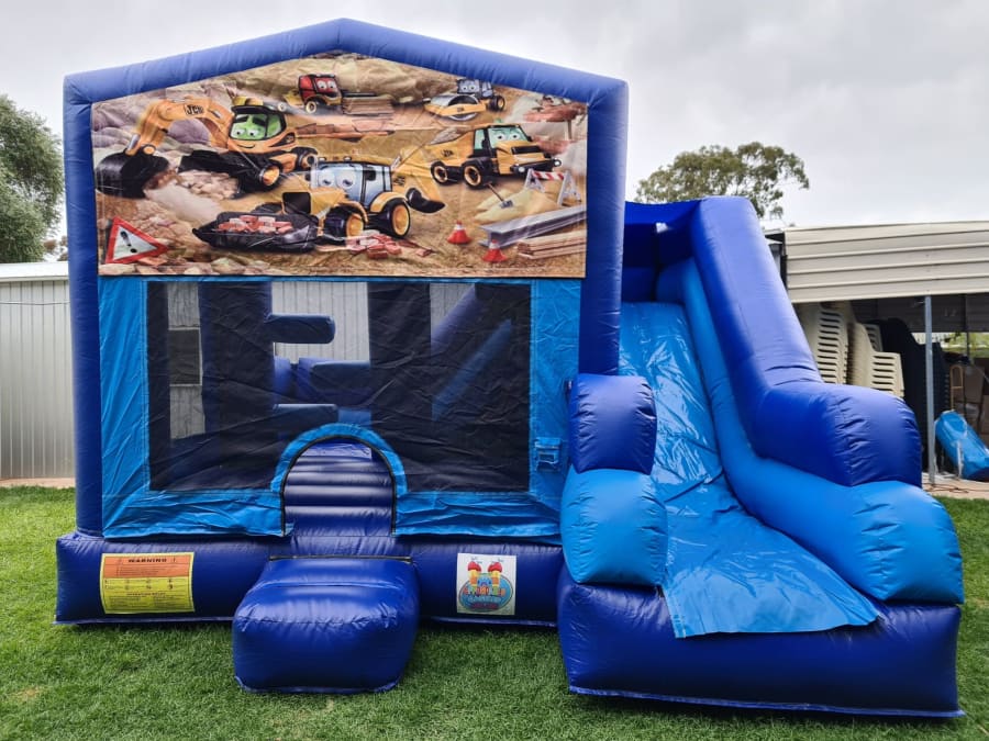 This castle features a jumping area, push obstacles, climbing stairs, external slide and a basketball hoop (Supply own plastic ball)
