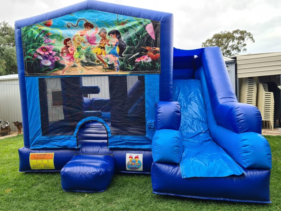 This castle features a jumping area, push obstacles, climbing stairs, external slide and a basketball hoop (Supply own plastic ball)