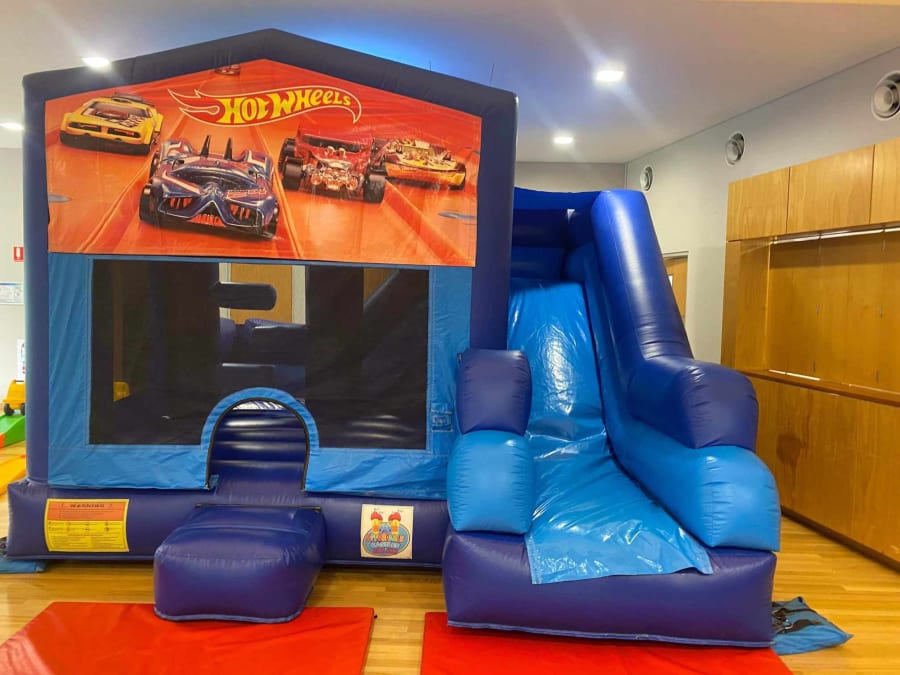 This castle features a jumping area, push obstacles, climbing stairs, external slide and a basketball hoop (Supply own plastic ball)