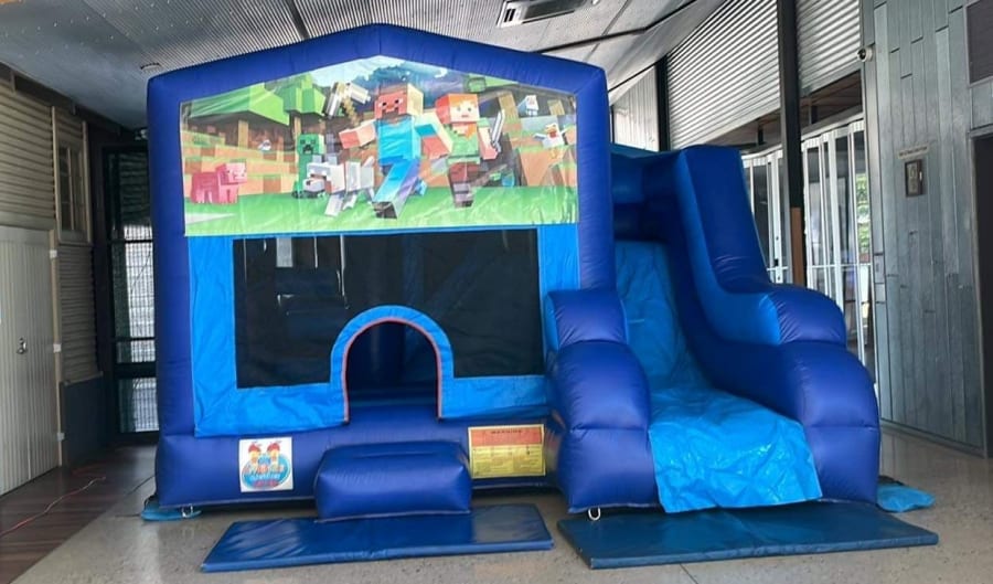 This castle features a jumping area, push obstacles, climbing stairs, external slide and a basketball hoop (Supply own plastic ball)