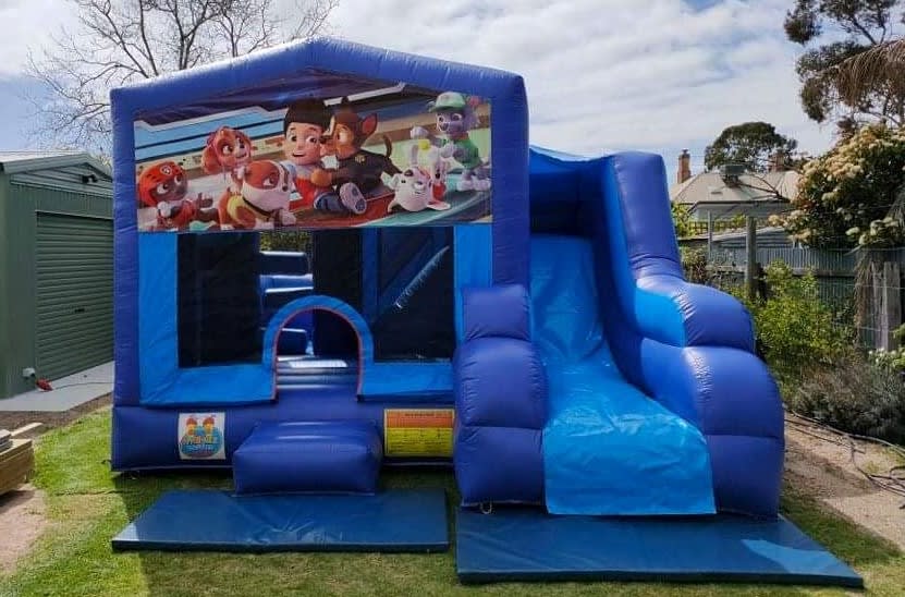 This castle features a jumping area, push obstacles, climbing stairs, external slide and a basketball hoop (Supply own plastic ball)
