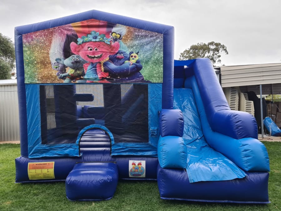 This castle features a jumping area, push obstacles, climbing stairs, external slide and a basketball hoop (Supply own plastic ball)