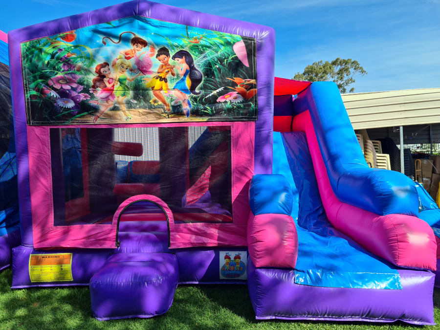 This castle features a jumping area, push obstacles, climbing stairs, external slide and a basketball hoop (Supply own plastic ball)