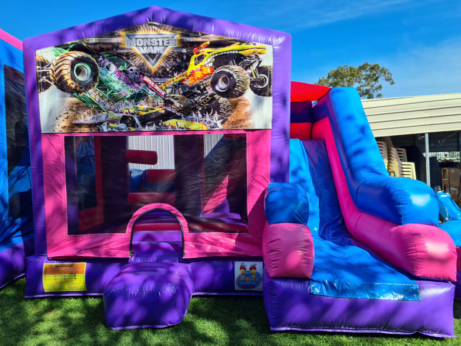 This castle features a jumping area, push obstacles, climbing stairs, external slide and a basketball hoop (Supply own plastic ball)