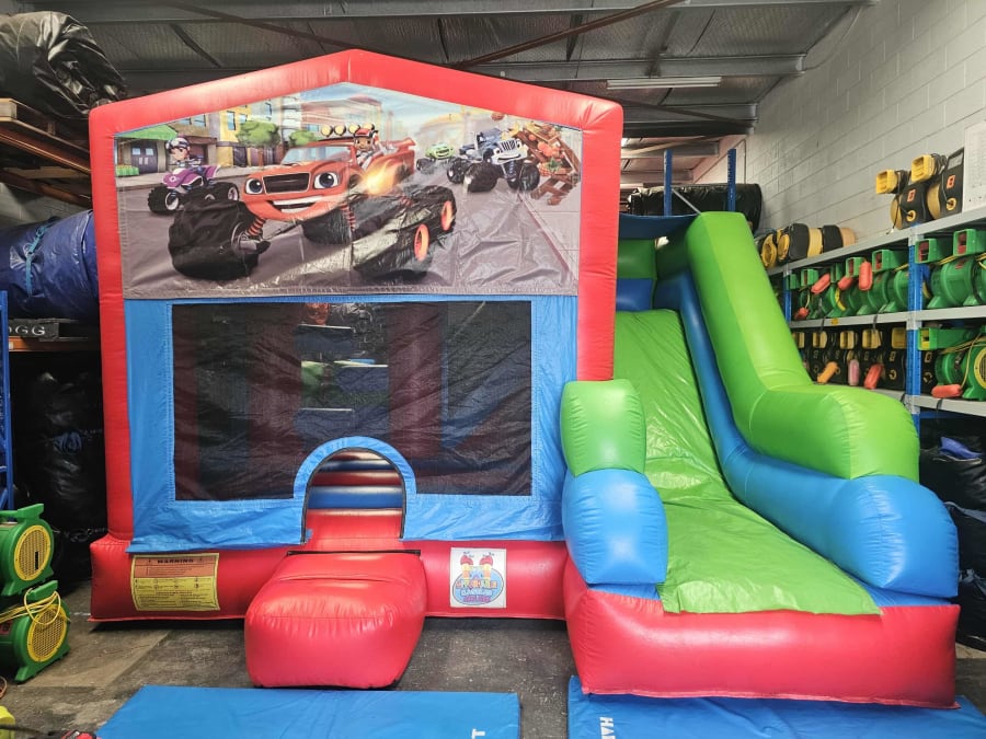 This castle features a jumping area, push obstacles, climbing stairs, external slide and a basketball hoop (Supply own plastic ball)