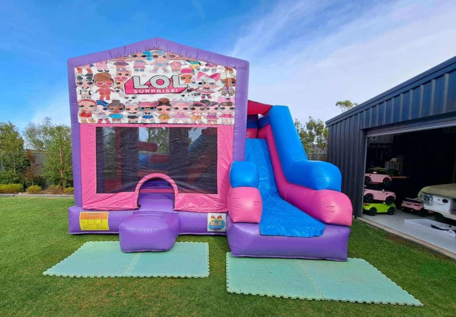 This castle features a jumping area, push obstacles, climbing stairs, external slide and a basketball hoop (Supply own plastic ball)