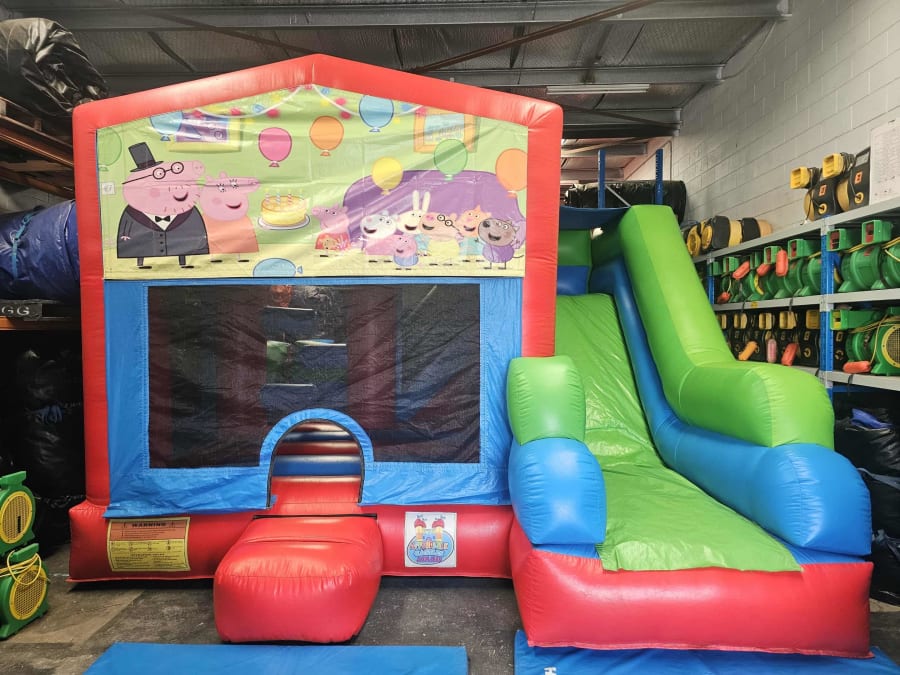 This castle features a jumping area, push obstacles, climbing stairs, external slide and a basketball hoop (Supply own plastic ball)