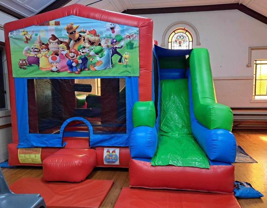 This castle features a jumping area, push obstacles, climbing stairs, external slide and a basketball hoop (Supply own plastic ball)