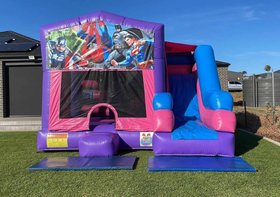 This castle features a jumping area, push obstacles, climbing stairs, external slide and a basketball hoop (Supply own plastic ball)