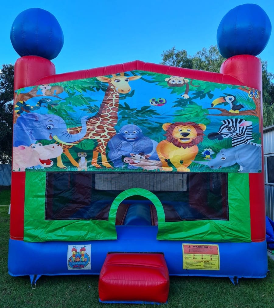 Example to book this castle Hi Sam, I'm after the B44 Jungle Safari Animals jumping castle for Jan 1st in Elizabeth 4hr hire 12-4pm on green grass and can use pegs, is it available? (your name)