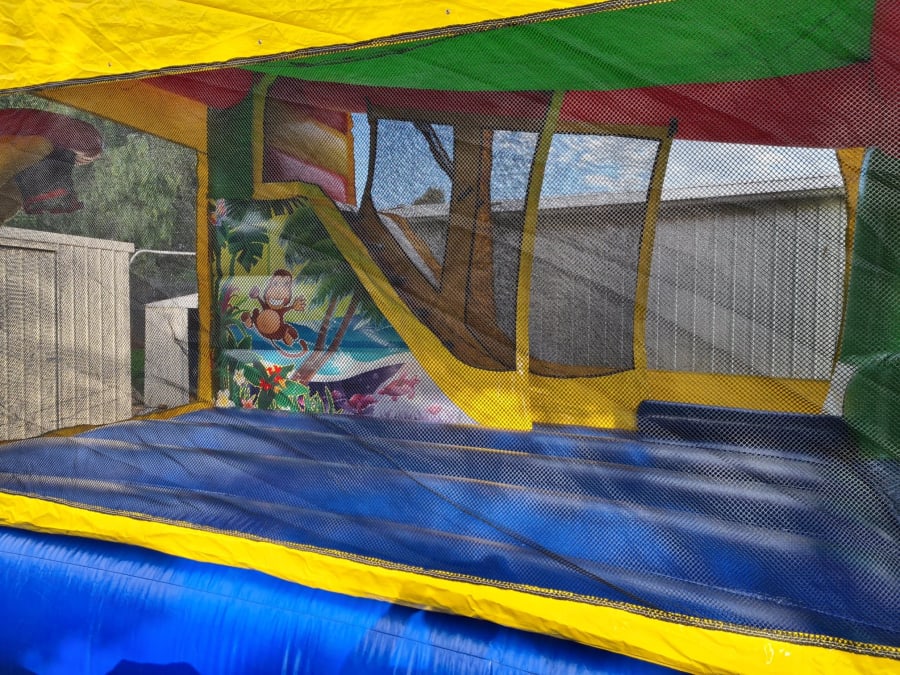 Features: Large bounce area, Climbing Stairs, Slide and basketball ring (supply own pvc balls)