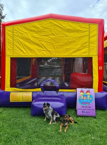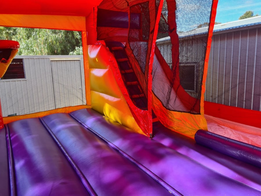 Features: Large bounce area, Climbing Stairs, Slide and basketball ring (supply own pvc balls)