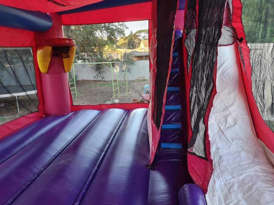Features: Large bounce area, Climbing Stairs, Slide and basketball ring (supply own pvc balls)