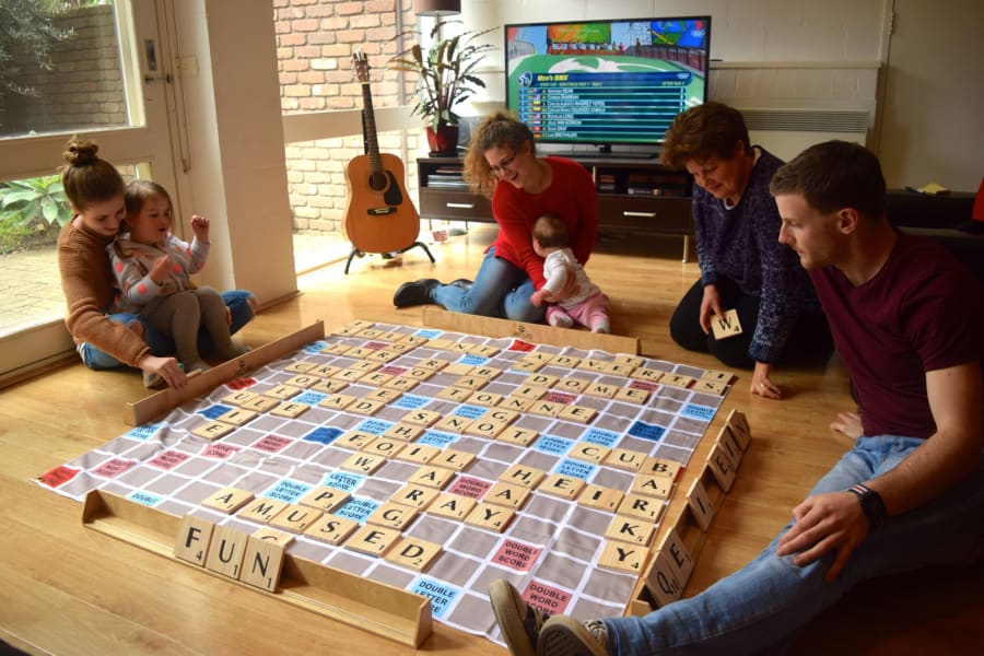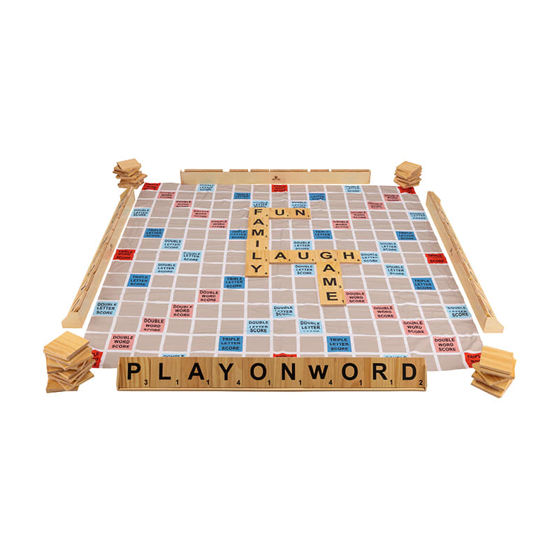 This game includes 100 wooden square tiles (8.5cm each), 4 Double Row Racks (88cm each), 1.5m square high quality vinyl mat, 4 steel pegs, and1 nylon carry bag.